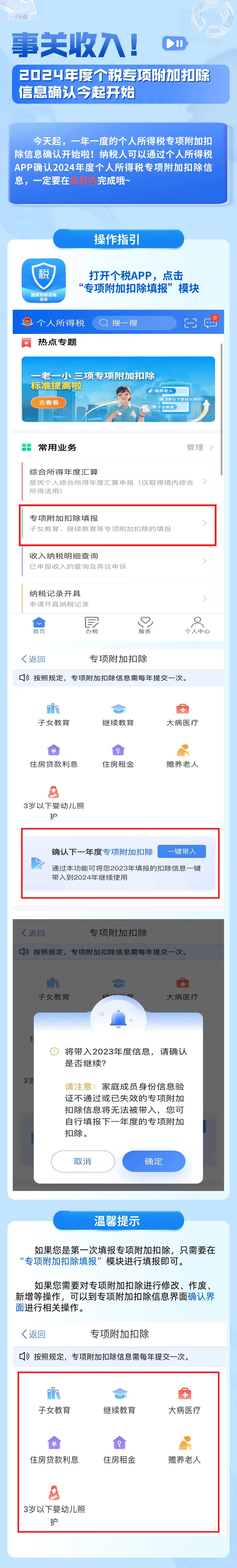 今天起,一年一度的個人所得稅專項附加扣除信息確認(rèn)開始啦!納稅人可以通過個人所得稅APP確認(rèn)2024年度個人所得稅專項附加扣除信息,一定要在本月內(nèi)完成哦~
